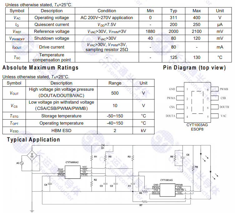 adopts linear constant current technology to set the maximum driving current of LED string through external resistor. The output drive current can be adjusted by external input PWM pin voltage. The PWM waveform can be converted to a dimming voltage by a simple filter circuit. CYT1003AG can result the LED light string fully turned off.