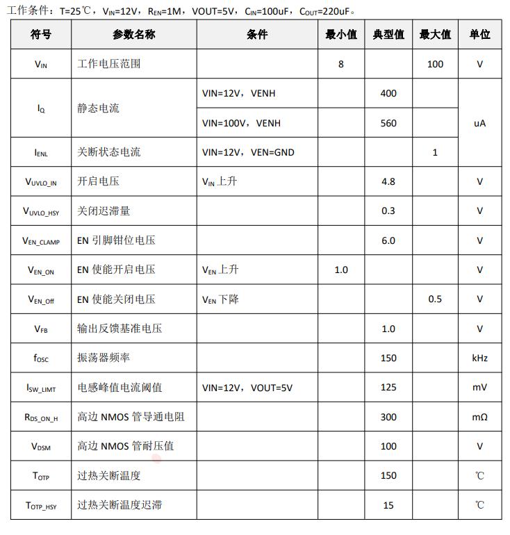 特性  ? 寬輸入電壓范圍:8V-100V  ? 最大 1.5A 輸出電流  ? 電感最大峰值電流可調節  ? 低待機功耗  ? 外置 FB 引腳,輸出電壓可調節  ? 支持 EN 使能控制  ? 異步降壓開關頻率 150KHz  ? 內置軟啟動  ? 內置過溫保護、輸出短路保護  ? 封裝形式 ESOP8