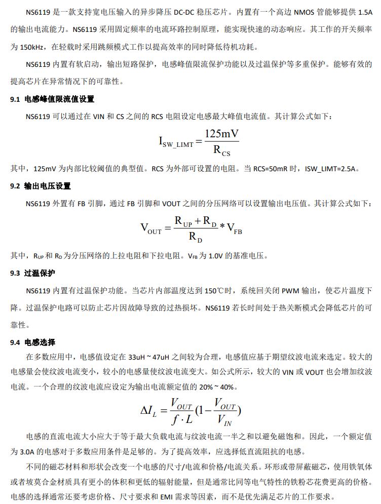 NS6119 是一款支持寬電壓輸入的異步降壓  DC-DC 穩壓芯片。內置有一個高邊 NMOS 管能夠提  供 1.5A 的輸出電流能力。NS6119 采用電流模式的環  路控制原理,實現了快速的動態響應。芯片還集成  有過溫保護,輸出短路保護和輸入欠壓保護等多重  保護功能。