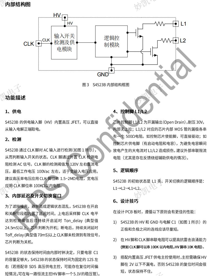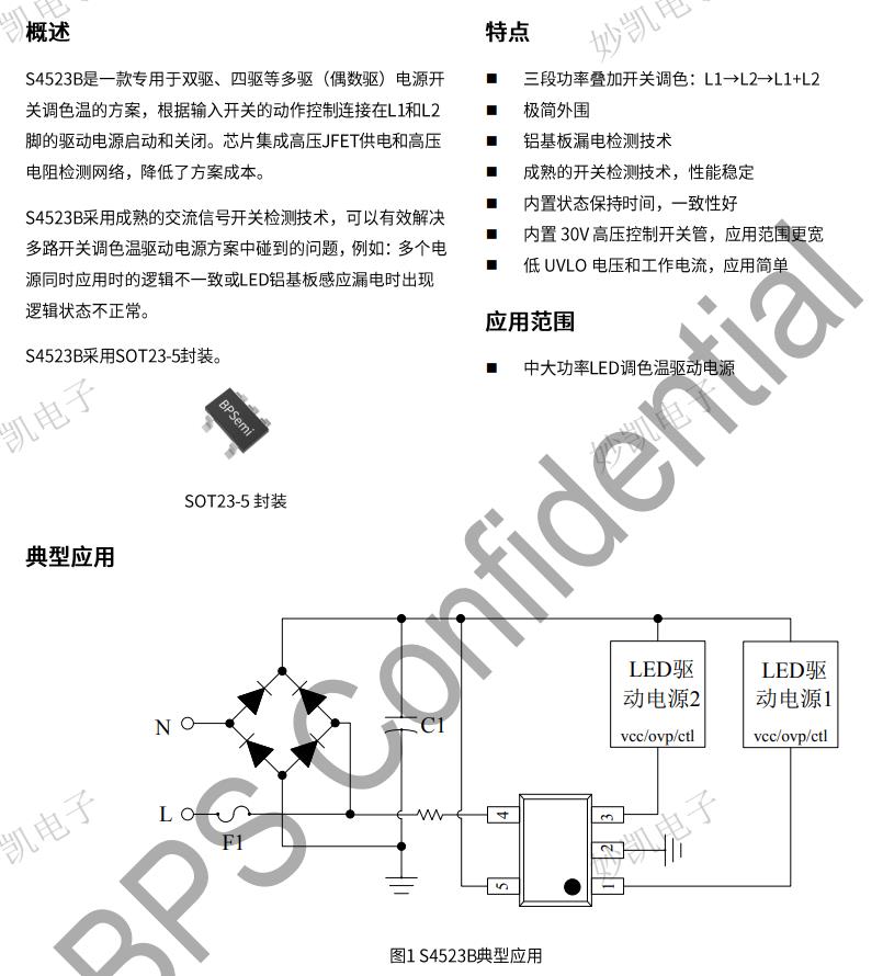 S4523B/RB是一款專用于雙驅、四等多驅(偶數驅) 電源開關調色溫的方案,根據輸入開關的動作控制連接在L1和L2腳的驅動電源啟動和關閉。芯片集成高壓JFET供電和高壓電阻檢測網絡,降低了方案成本。S4523B/RB采用成熟的交流信號開關檢測技術,可以有效解決多路開關調色溫驅動電源方案中碰到的問題,例如:多個電源同時應用時的邏輯不一致或LED鋁基板感應漏電時出現邏輯狀態不正常。