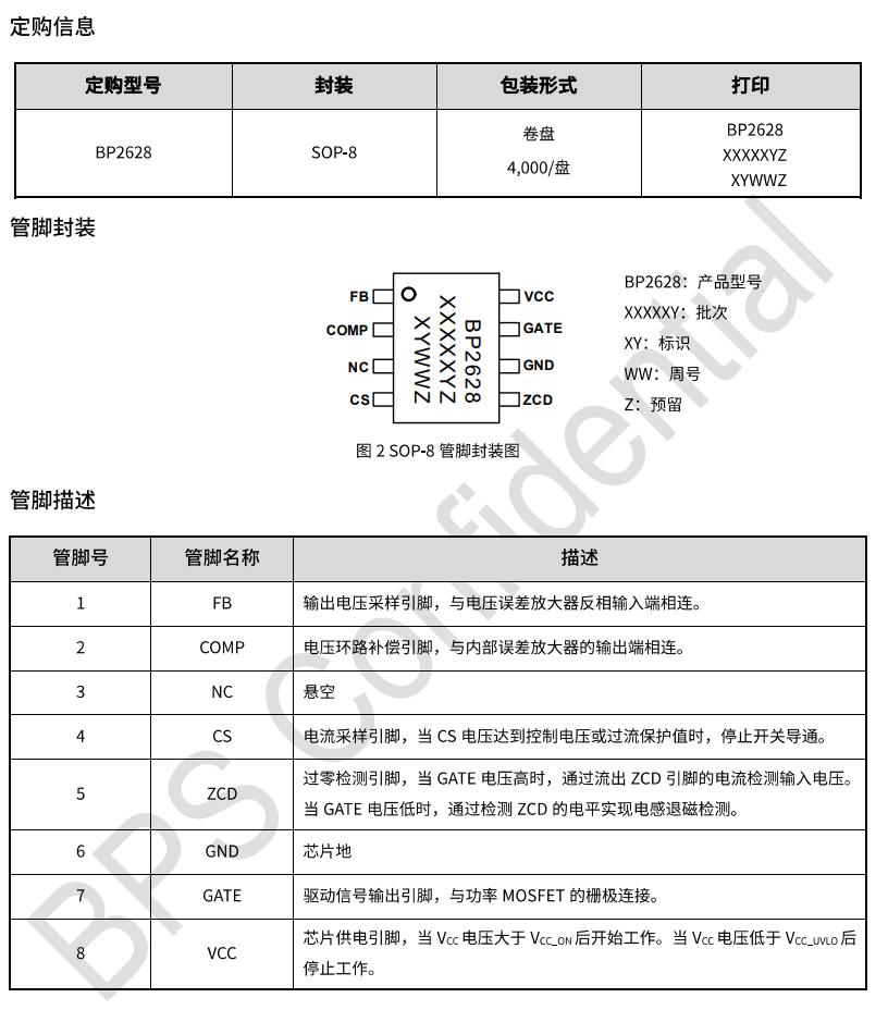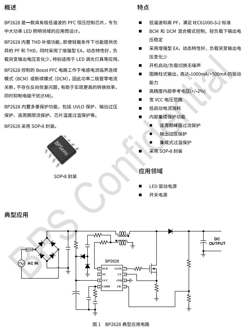 BP2638 內置多重保護功能,包括 UVLO 保護、輸出過壓保護、輸入過欠壓保護、逐周期限流保護、芯片溫度過溫保護等。 優勢 低諧波和高 PF,滿足IEC61000-3-2 標準 BCM 和 DCM 混合模式控制,輕負載下輸出電壓穩定 采用增強型 EA,動態特性好,負載突變輸出電壓變化少 開機啟動/負載切換無噪聲 高精度內部參考電壓(+/-2%) 寬 VCC 電壓范圍