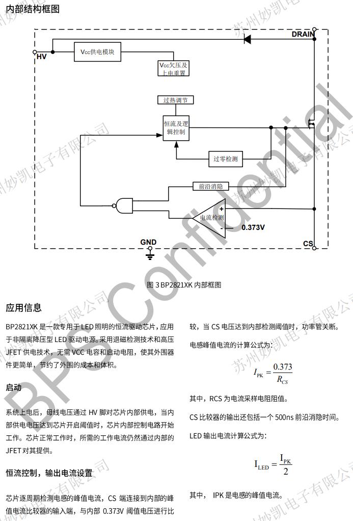 BP2821XK芯片內置高精度的電流采樣電路,同時采用了恒流控制技術,實現高精度的LED恒流輸出和優異的線電壓調整率。芯片工作在電感電流臨界模式,輸出電流不隨電感量和LED工作電壓的變化而變化,實現優異的負載調整率。BP2821XK具有多重保護功能,包括LED短路保護,芯片溫度過熱調節等。BP2821XK采用ESSOP6封裝。