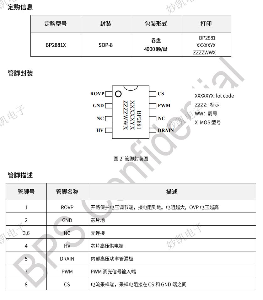 | BP2881D | SOP8 | 0.5 | Buck | <24W | 500V/4.8Ω | Y | PWM |