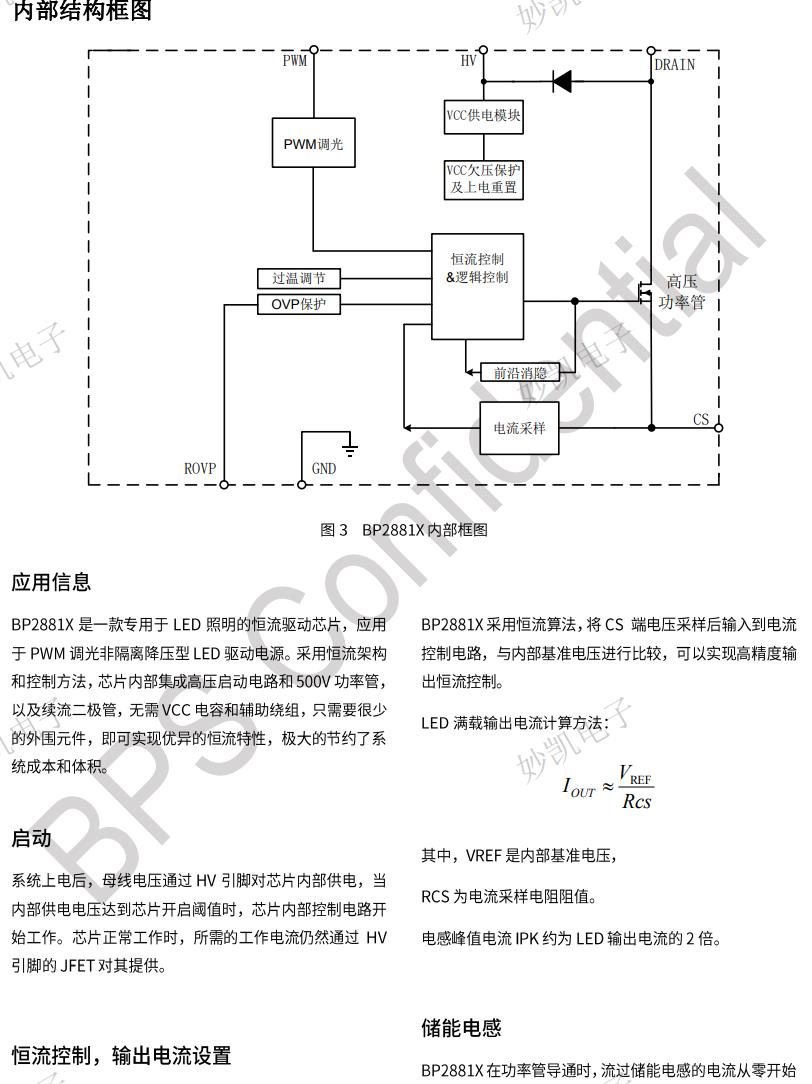 BP2881D芯片集成高壓?jiǎn)?dòng)電路和500V功率管,以及續(xù)流二極管,無(wú)需VCC電容和輔助繞組,只需要很少的外圍元件,即可實(shí)現(xiàn)優(yōu)異的恒流特性,極大的節(jié)約了系統(tǒng)成本和體積。