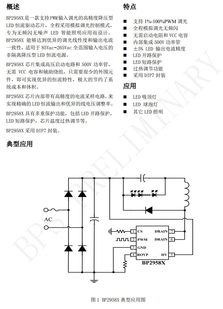 BP2958X芯片內部帶有高精度的電流采樣電路,來實現精確的 LED 恒流輸出和優異的線電壓調整率。BP2958X具有多重保護功能,包括LED開路保護,LED短路保護,芯片溫度過熱調節等。