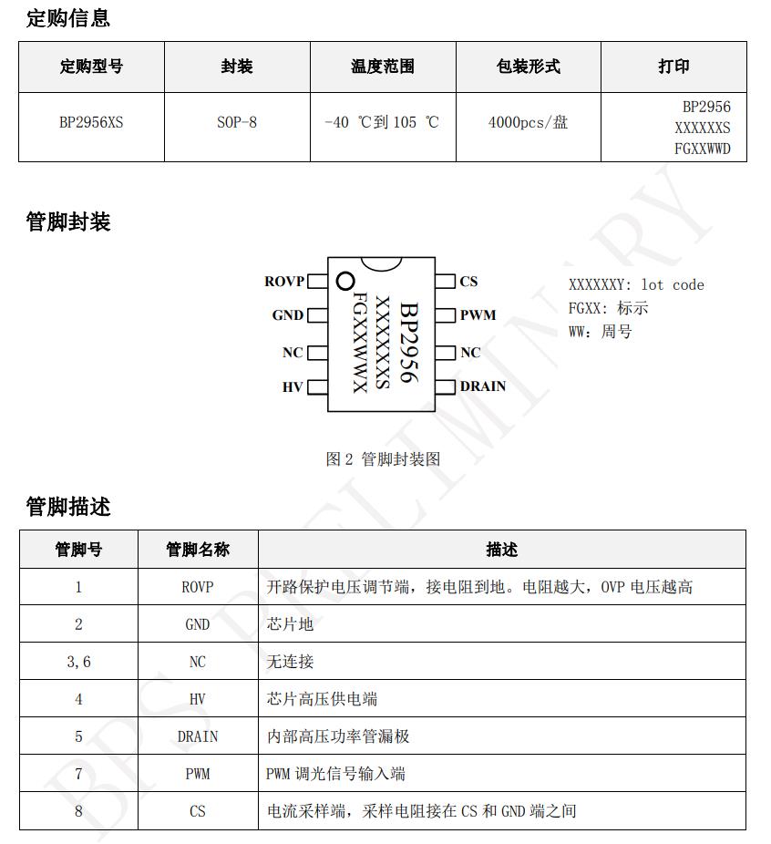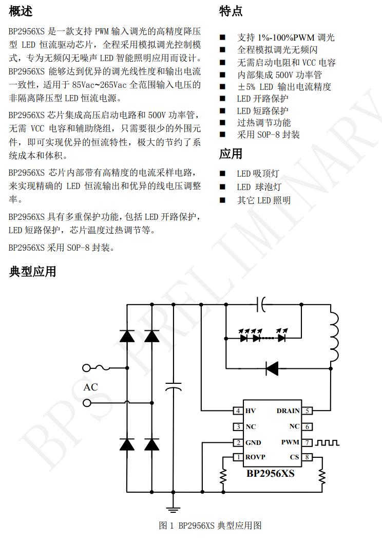 BP2956XS 具有多重保護功能,包括 LED 開路保護, LED 短路保護,芯片溫度過熱調節等。 BP2956XS 采用 SOP-8 封裝。