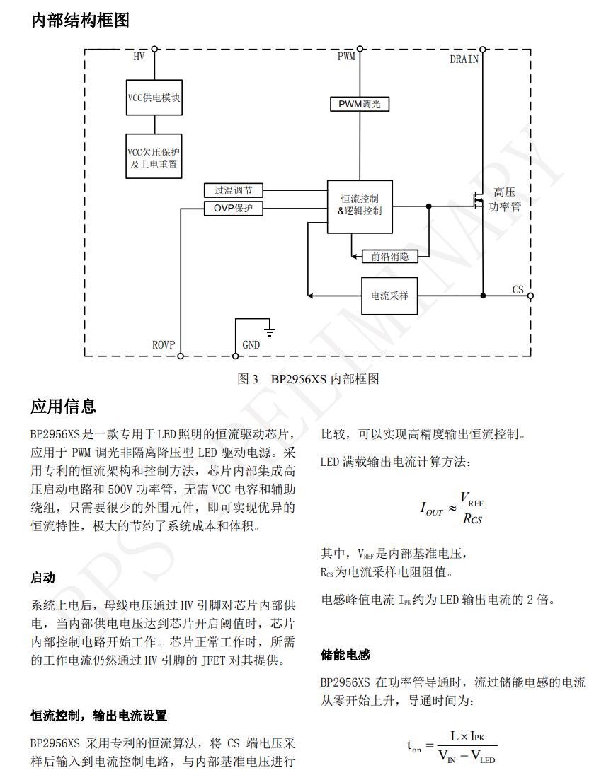 BP2956XS 芯片內部帶有高精度的電流采樣電路, 來實現精確的 LED 恒流輸出和優異的線電壓調整 率。