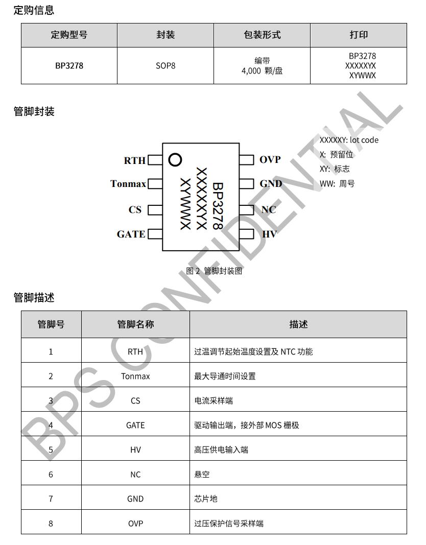 BP3278具有多重保護功能,包括LED 開路保護 (過壓保護),芯片溫度過熱調節等。BP3278 采用 SOP-8 封裝。