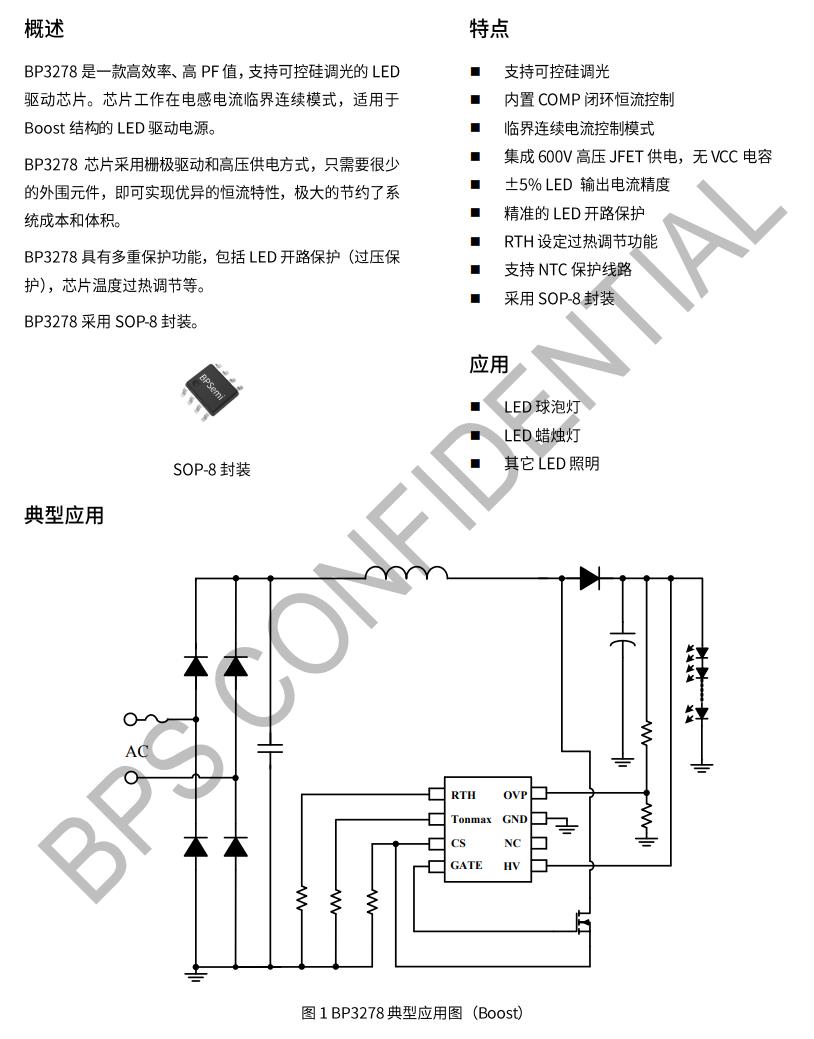 BP3278是一款高效率、高PF值,支持可控硅調光的LED驅動芯片。芯片工作在電感電流臨界連續模式,適用于Boost結構的LED驅動電源。BP3278芯片采用柵極驅動和高壓供電方式,只需要很少的外圍元件,即可實現優異的恒流特性,極大的節約了系統成本和體積。BP3278具有多重保護功能,包括LED開路保護(過壓保護),芯片溫度過熱調節等。BP3278采用SOP-8封裝。