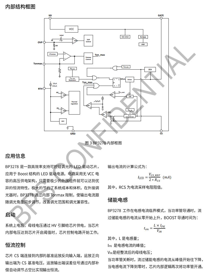 BP3278是一款高效率高PF 值,支持可控硅調光的 LED驅動芯片。芯片工作在電感電流臨界連續模式,適用于Boost結構的LED 驅動電源。 BP3278芯片采用極驅動和高壓供電方式,只需要很少的外圍元件,即可實現優異的恒流特性,極大的節約了系統成本和體積。