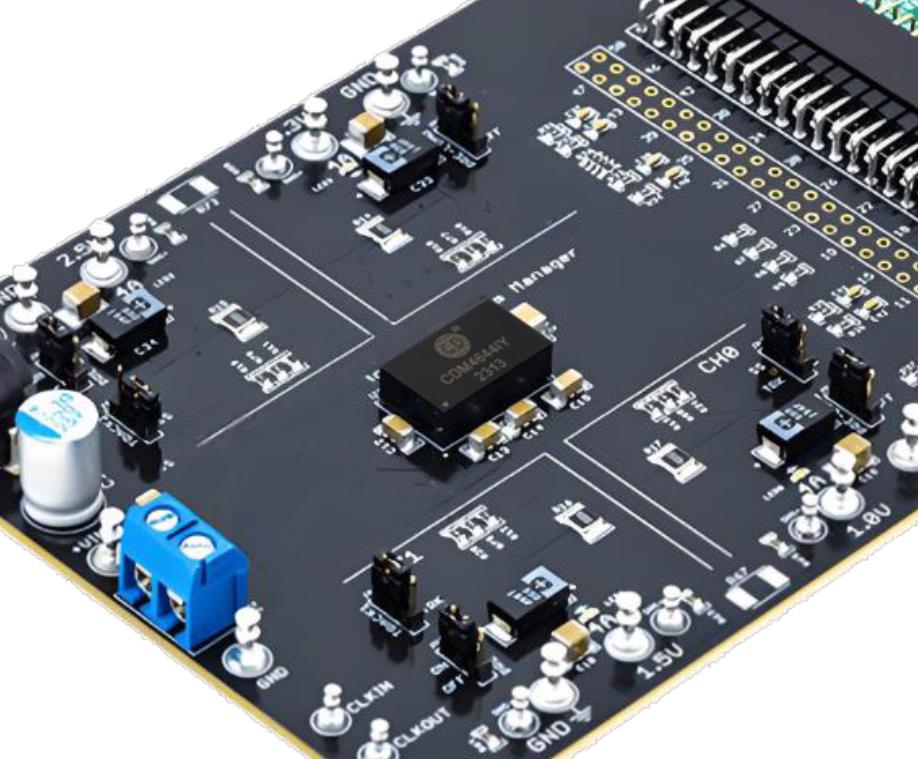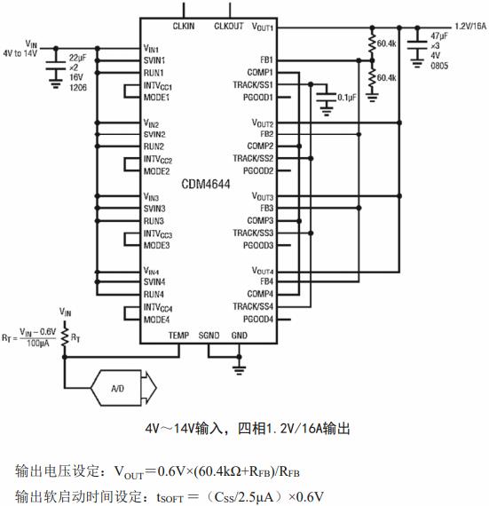 CDM4644是一款獨立四通道4A降壓型DC/DC微模塊電源。可多路輸出或者并聯陣列輸出,最大可輸出16A電流。模塊內置開關控制器、功率FET、電感器、高精度上分壓電阻(0.1%)和配套元件,外部僅需少量濾波/保持電容器及電阻即可構成完整的降壓式四路輸出DC/DC穩壓器。模塊輸入電壓范圍4V~14V,通過一個外置取樣電阻可在0.6V~5.5V范圍設置輸出電壓。模塊支持外部頻率同步、連續/非連續模式和輸出電壓跟蹤排序操作。模塊具有內置溫度監測、過溫、過壓和過流保護功能。