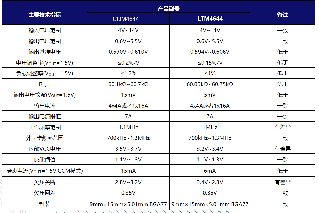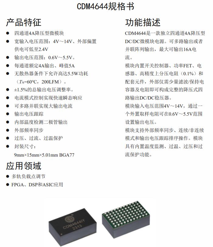 | CDM4644 | LTM4644 | DC/DC Micro-module regulator | 4V~14V | 0.6V~5.5V | -40℃~125℃ | BGA-77 |