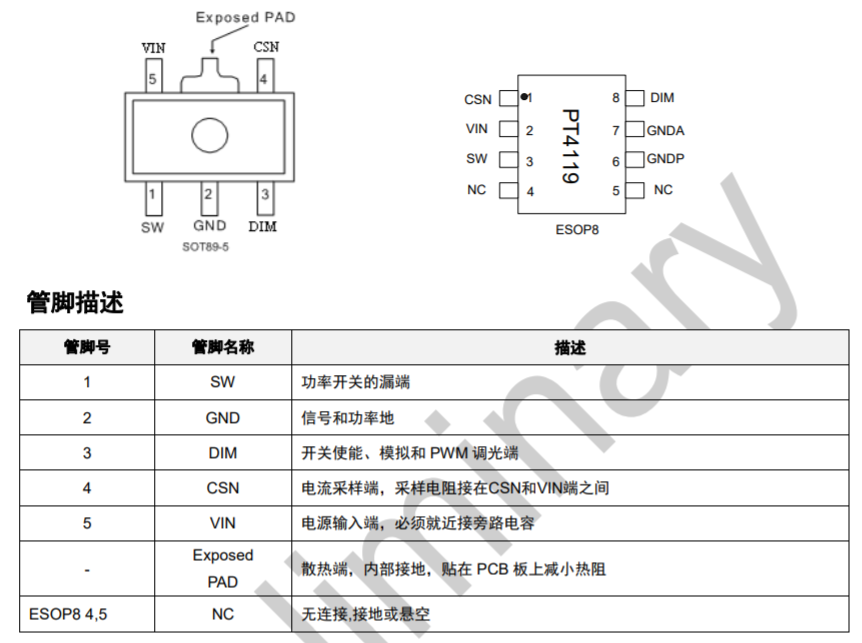 PT4119E 采用 SOT89-5 封裝和 ESOP8 封裝。