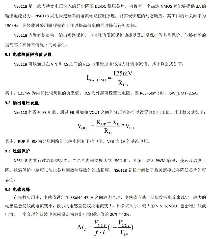 NS6118 是一款支持寬電壓輸入的異步降壓  DC-DC 穩壓芯片。內置有一個高邊 NMOS 管能夠提  供 2A 的輸出電流能力。NS6118 采用電流模式的環  路控制原理,實現了快速的動態響應。芯片還集成  有過溫保護,輸出短路保護和輸入欠壓保護等多重  保護功能。
