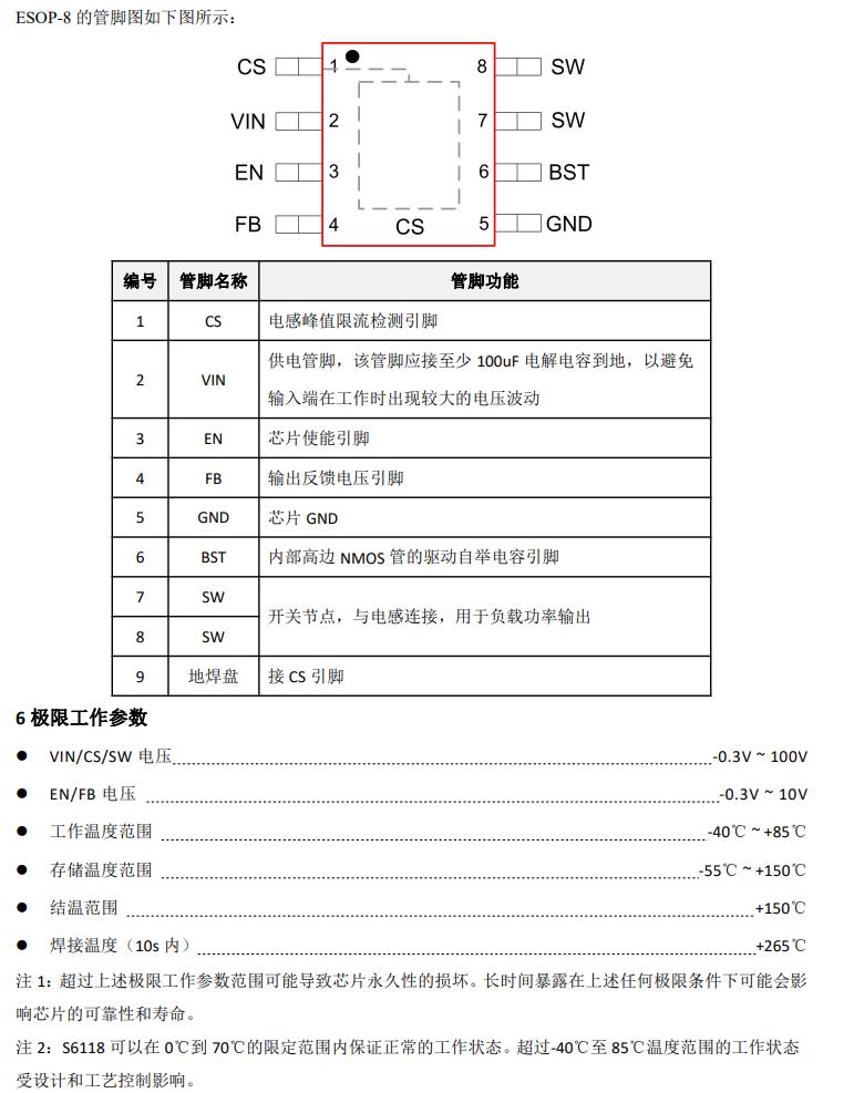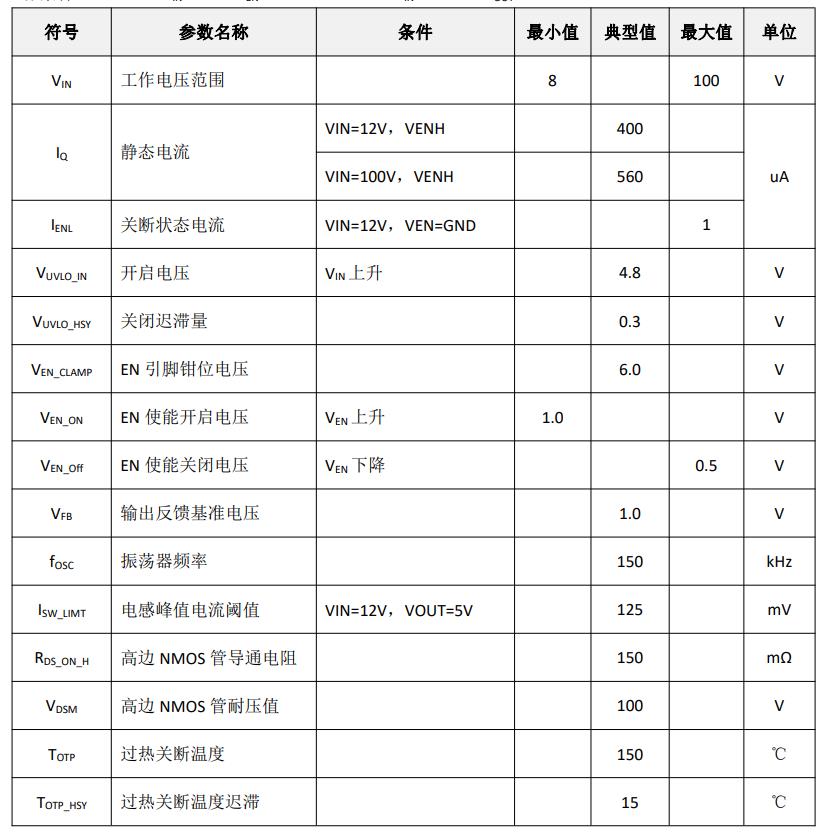 特性  ? 寬輸入電壓范圍:8V-100V  ? 最大 2A 輸出電流  ? 電感最大峰值電流可調節  ? 低待機功耗  ? 外置 FB 引腳,輸出電壓可調節  ? 支持 EN 使能控制  ? 異步降壓開關頻率 150KHz  ? 內置軟啟動  ? 內置過溫保護、輸出短路保護  ? 封裝形式 ESOP8