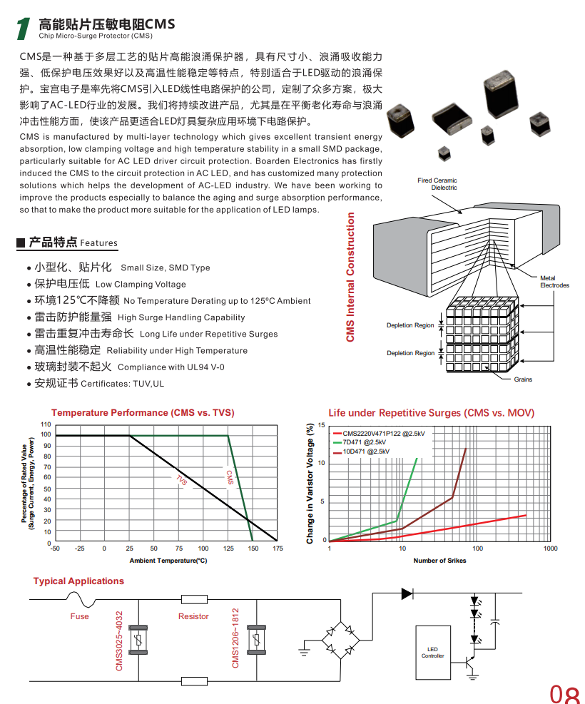 陶瓷微浪涌保護(hù)裝置(CMS)由半導(dǎo)體陶瓷制成,提供在小型SMD封裝中提供堅(jiān)固的保護(hù)和出色的瞬態(tài)能量吸收。這些設(shè)備旨在抑制各種瞬態(tài)事件,包括IEC61000-4-2、IEC61000-4-5和其他標(biāo)準(zhǔn)中規(guī)定的瞬態(tài)事件用于電磁兼容性(EMC)。