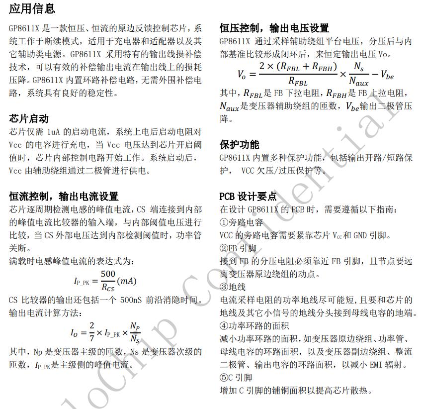 GP8611X是一款恒壓、恒流的原邊反饋QR導通控制芯片,適用于充電器和適配器。GP8611X采用特有的輸出線損補償技術,可以有效的補償輸出電流在輸出線上的損耗壓降。