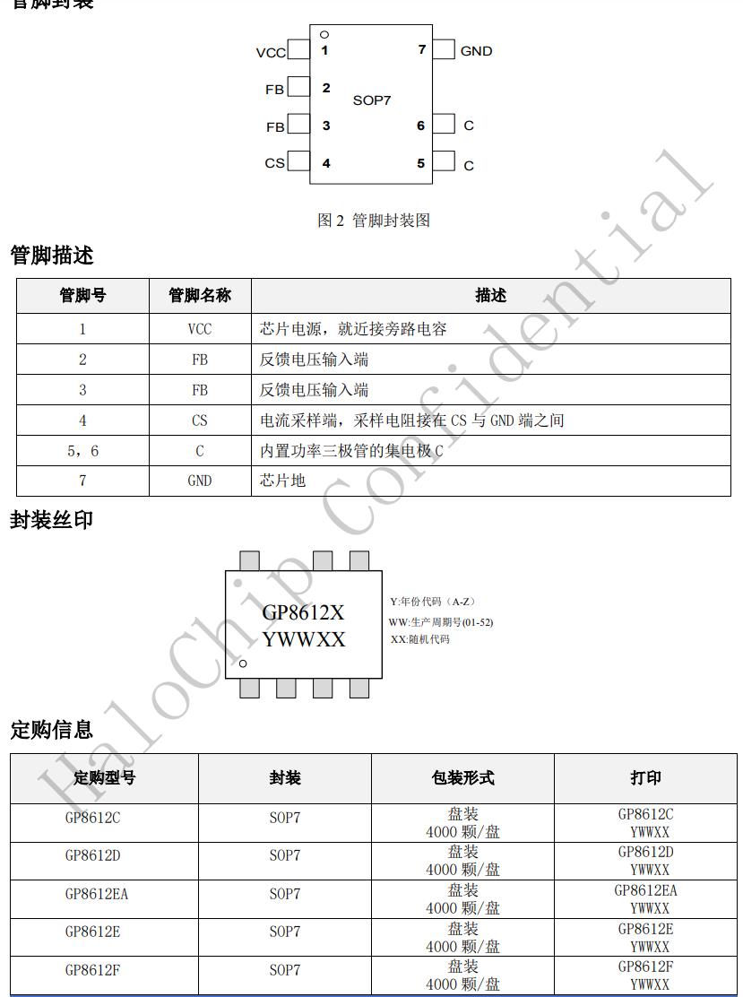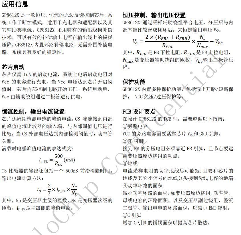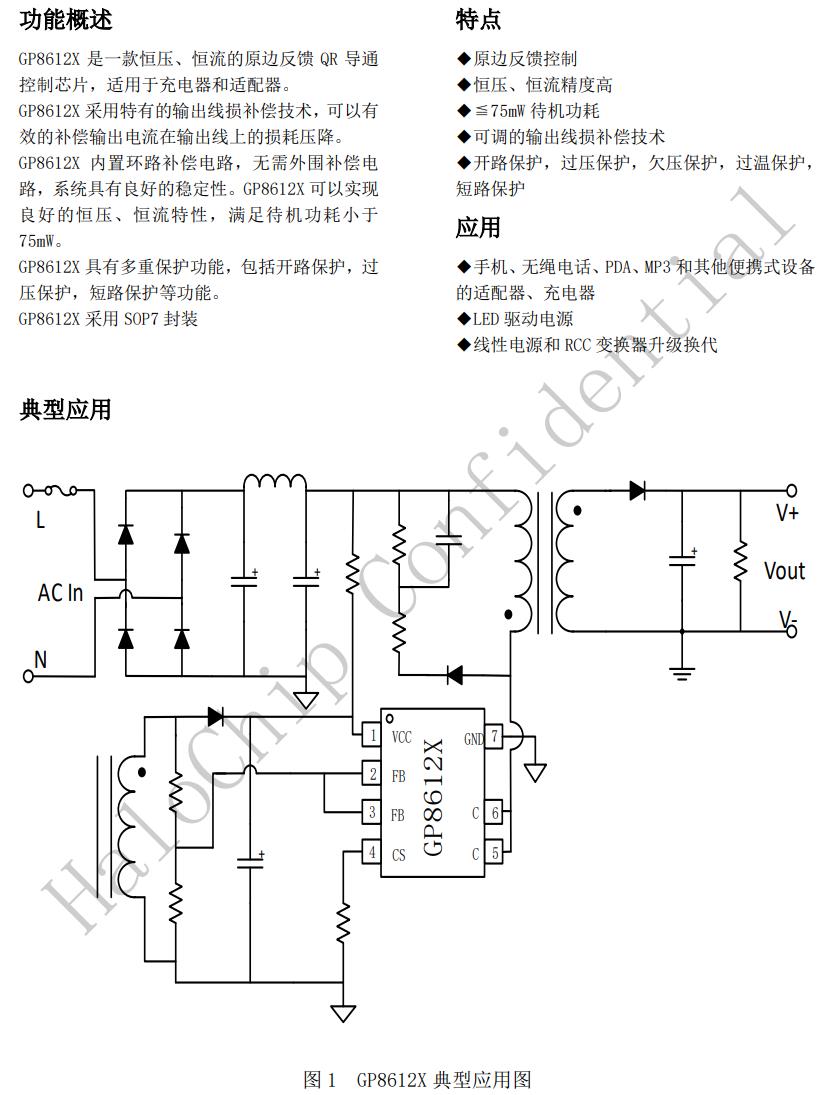 GP8612X是一款恒壓、恒流的原邊反饋QR導通控制芯片,適用于充電器和適配器。GP8612X采用特有的輸出線損補償技術(shù),可以有效的補償輸出電流在輸出線上的損耗壓降。