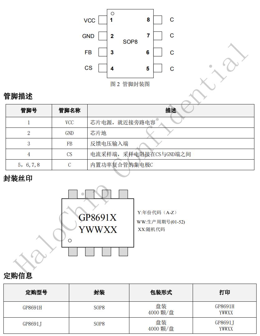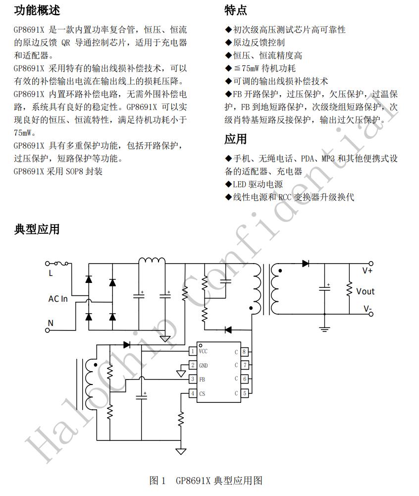 GP8691X可以實現良好的恒壓、恒流特性,滿足待機功耗小于75mW。GP8691X具有多重保護功能,包括開路保護,過壓保護,短路保護等功能。GP8691X采用SOP8封裝
