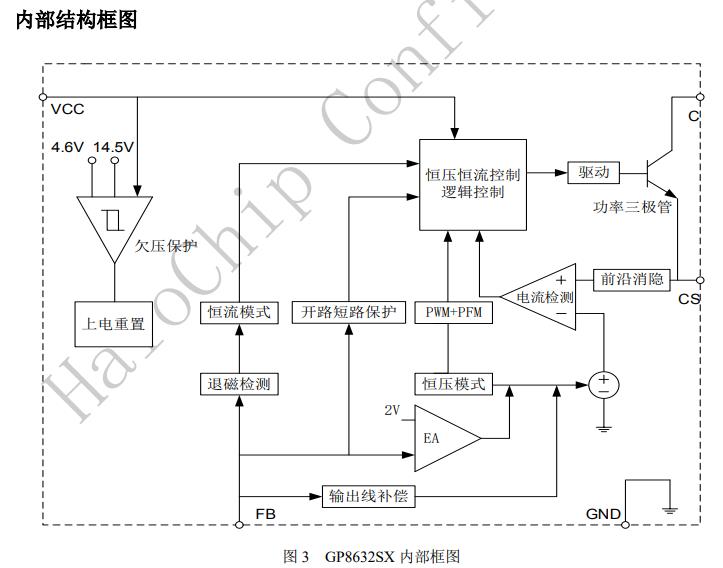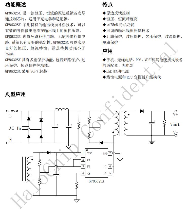 GP8632SX是一款恒壓、恒流的原邊反饋谷底導(dǎo)通控制芯片,適用于充電器和適配器。GP8632SX采用特有的輸出線損補(bǔ)償技術(shù),可以有效的補(bǔ)償輸出電流在輸出線上的損耗壓降。GP8632SX內(nèi)置環(huán)路補(bǔ)償電路,無(wú)需外圍補(bǔ)償電路,系統(tǒng)具有良好的穩(wěn)定性。GP8632SX可以實(shí)現(xiàn)良好的恒壓、恒流特性,滿足待機(jī)功耗小于75mW。GP8632SX具有多重保護(hù)功能,包括開(kāi)路保護(hù),過(guò)壓保護(hù),短路保護(hù)等功能。GP8632SX采用SOP7封裝
