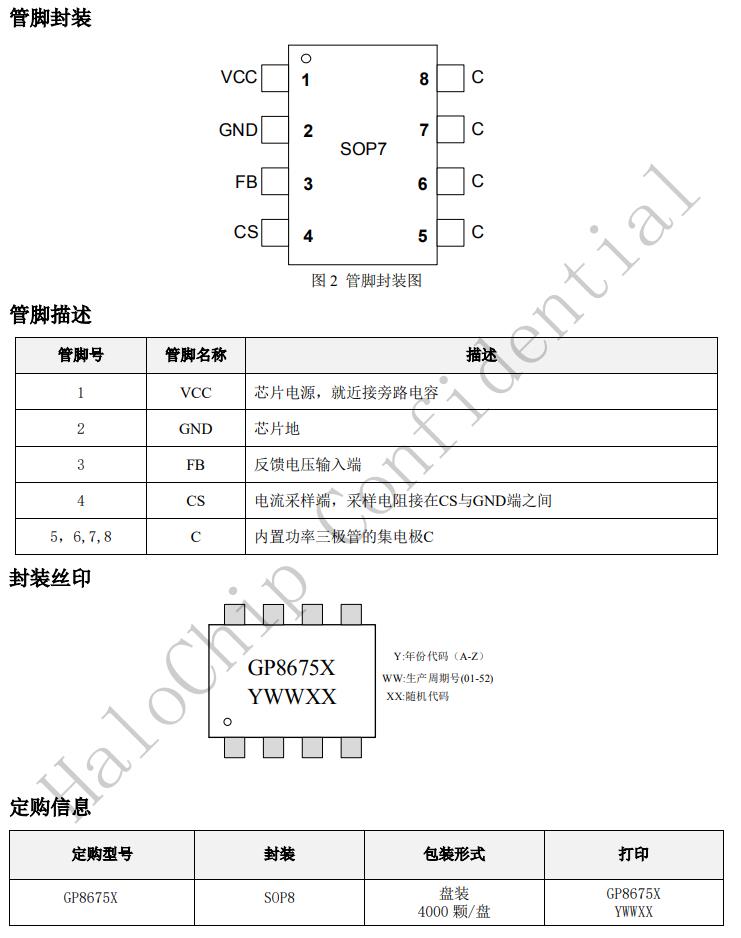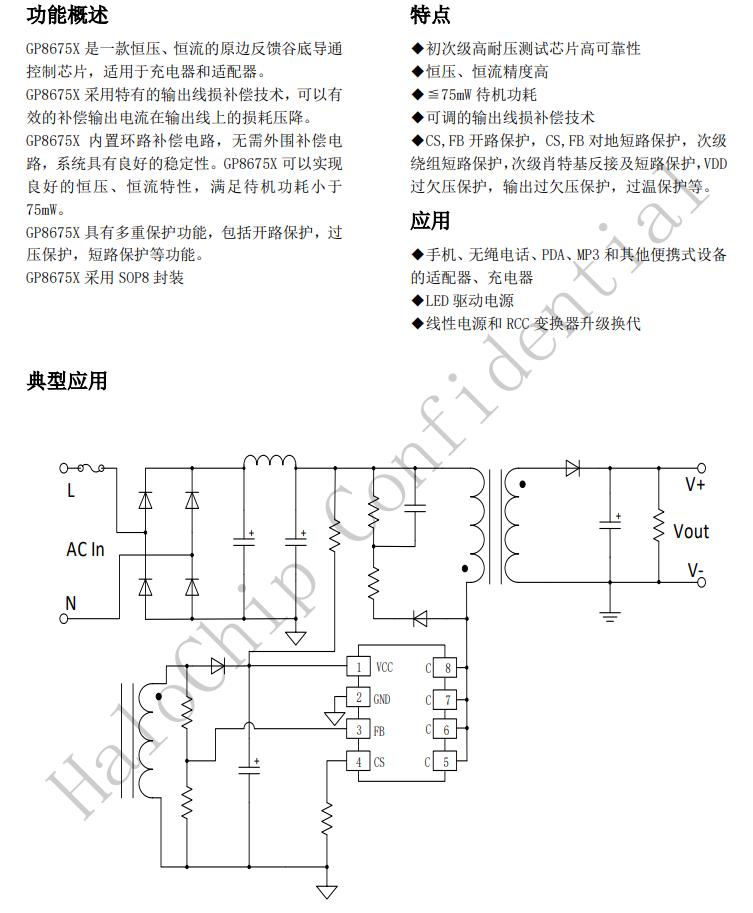 GP8675X具有多重保護(hù)功能,包括開路保護(hù),過壓保護(hù),短路保護(hù)等功能。GP8675X采用SOP8封裝