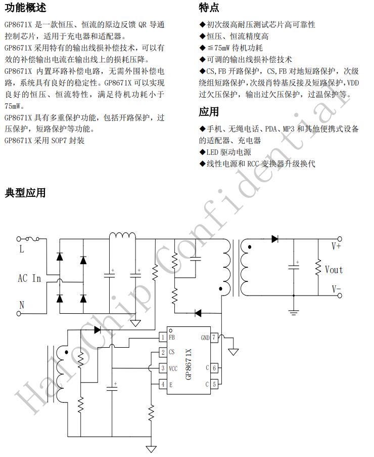初次級高耐壓測試芯片高可靠性恒壓、恒流精度高≦75mW待機(jī)功耗可調(diào)的輸出線損補(bǔ)償技術(shù)CS,F(xiàn)B開路保護(hù),CS,F(xiàn)B對地短路保護(hù),次級繞組短路保護(hù),次級肖特基反接及短路保護(hù),VDD過欠壓保護(hù),輸出過欠壓保護(hù),過溫保護(hù)等。
