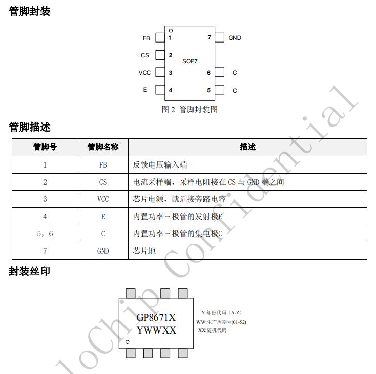 GP8671X具有多重保護(hù)功能,包括開路保護(hù),過壓保護(hù),短路保護(hù)等功能。GP8671X采用SOP7封裝