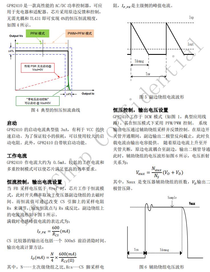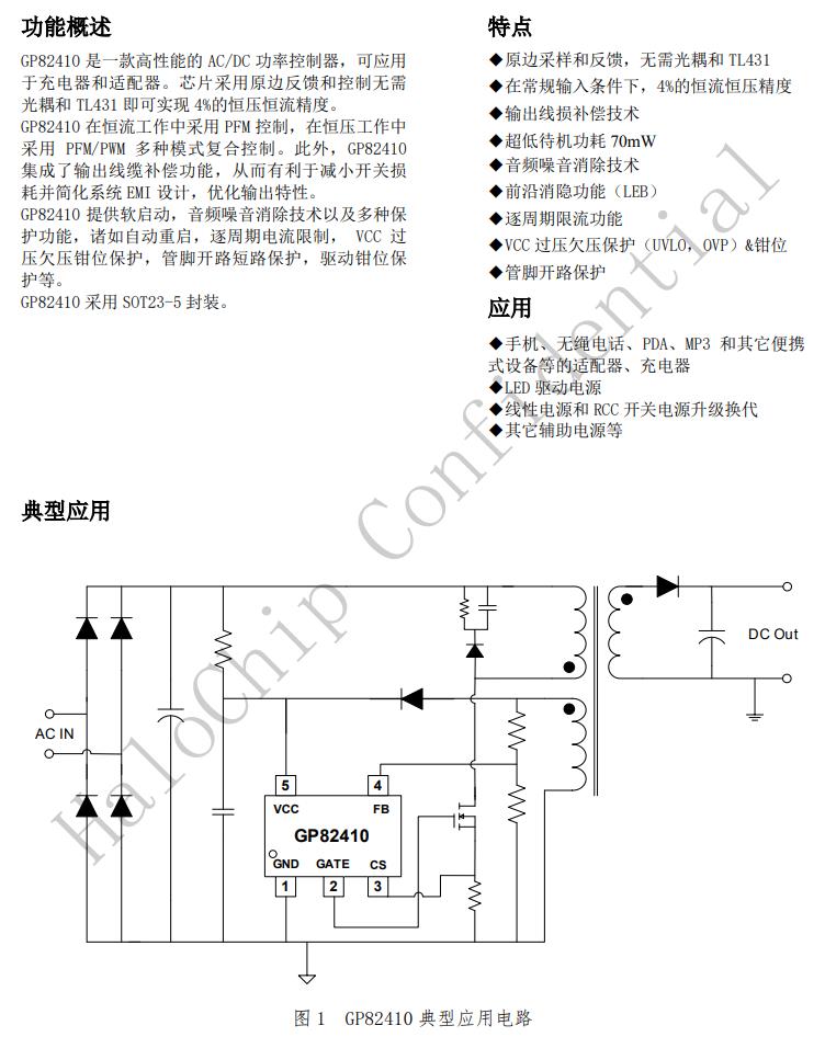 GP82410是一款高性能的AC/DC功率控制器,可應(yīng)用于充電器和適配器。芯片采用原邊反饋和控制無需光耦和TL431即可實(shí)現(xiàn)4%的恒壓恒流精度。