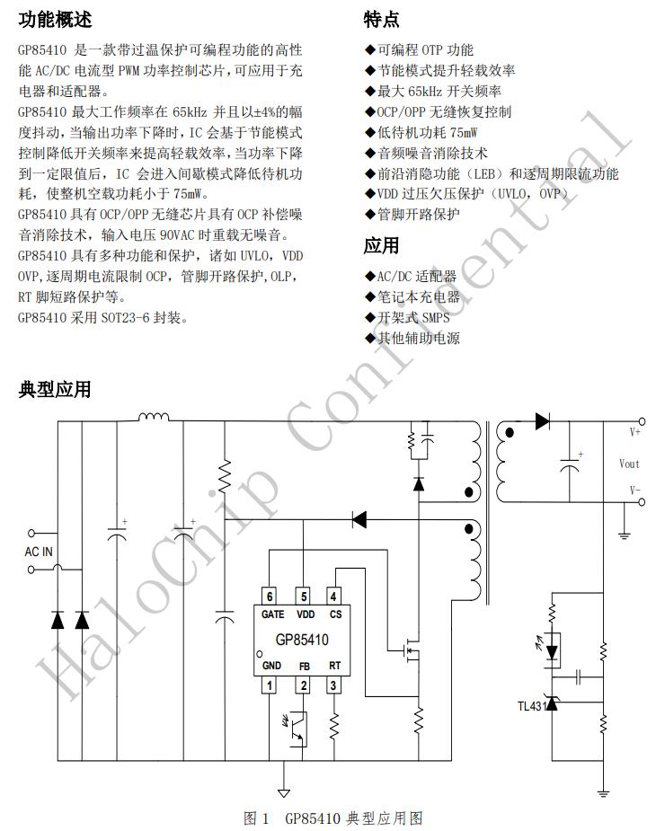 GP85410是一款帶過溫保護可編程功能的高性能AC/DC電流型PWM功率控制芯片,可應用于充電器和適配器。