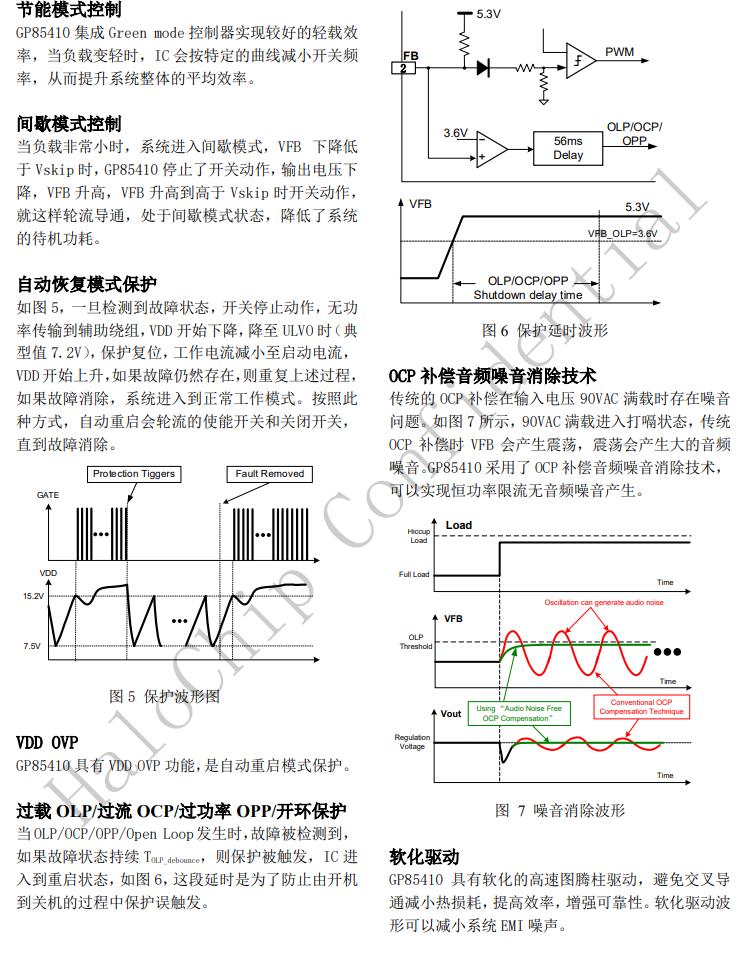 GP85410具有OCP/OPP無縫芯片具有OCP補償噪音消除技術,輸入電壓90VAC時重載無噪音。GP85410具有多種功能和保護,諸如UVLO,VDDOVP,逐周期電流限制OCP,管腳開路保護,OLP,RT腳短路保護等。