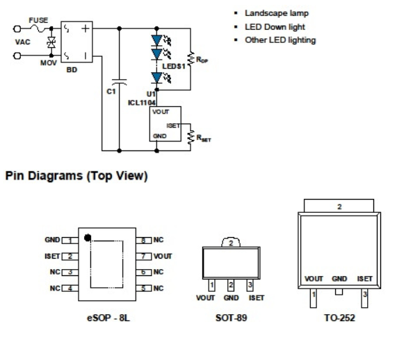 ICL1104 是一款單通道高壓線性 LED 恒流驅 動芯片,內部集成 650V 高壓 MOS。可通過外設電 阻對輸出電流進行設置,電流可在 5mA~80mA 范 圍內進行任意調節。 ICL1104 內置線性過溫保護功能,可以有效防 止系統溫度突變造成的損壞。 ICL1104 整個系統具有外圍簡單,應用靈活, 可靠性高,體積小,系統成本低等優點;合適的封 裝技術可應用于各類 LED 燈具。