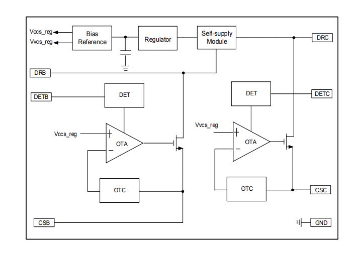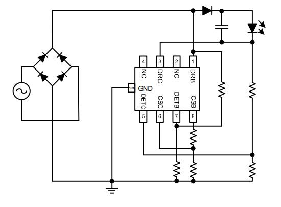 PM2036內部集成了兩個固定恒流源,兩個恒流  源之間的關系可以靈活配置,既可以獨立使用,  又可以并聯使用。獨立使用時,PM2036可以實現  單顆IC同時控制兩路LED,滿足可控硅調光的照  明應用;關聯使用時,PM2036有著異常靈活的應  用方案,既可以兼顧高功率因數,也可以配置成  功率因數大于0.9的光電一體化方案,可以使用傳  統可控硅調光器調光。