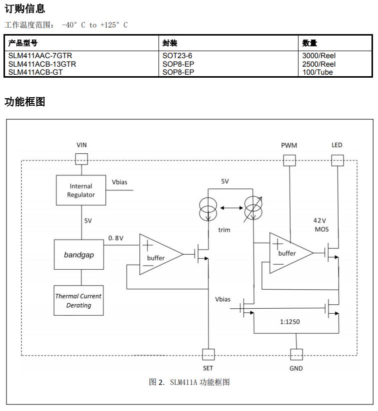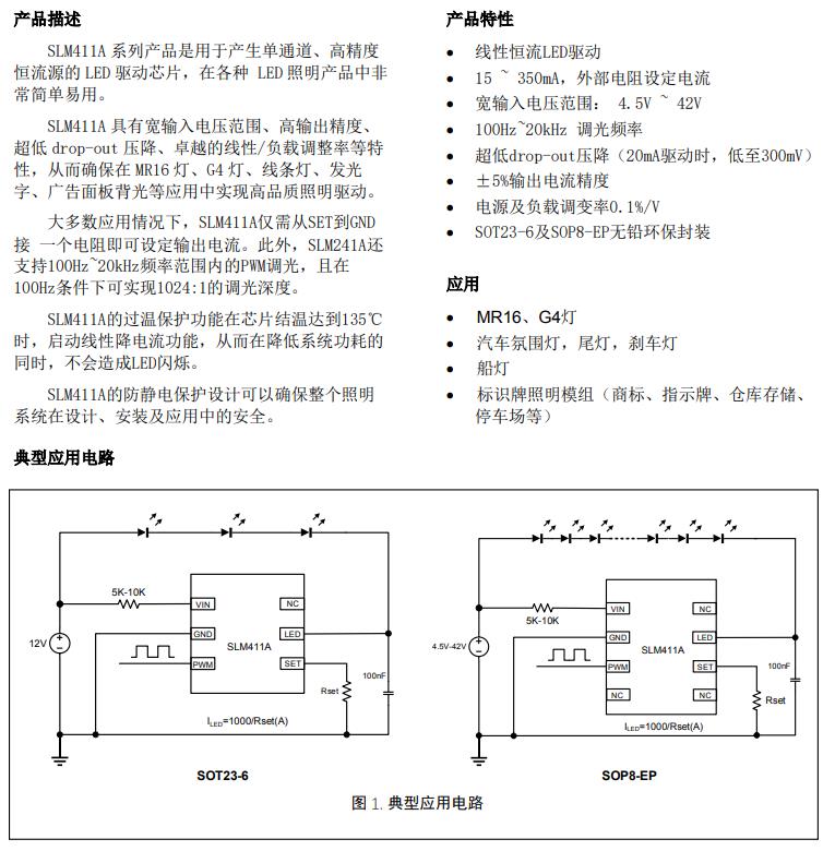 SLM411A 系列產品是用于產生單通道、高精度恒流源的 LED 驅動芯片,在各種 LED 照明產品中非常簡單易用。SLM411A 具有寬輸入電壓范圍、高輸出精度、超低 drop-out 壓降、卓越的線性/負載調整率等特性,從而確保在 MR16 燈、G4 燈、線條燈、發光字、廣告面板背光等應用中實現高品質照明驅動。大多數應用情況下,SLM411A僅需從SET到GND接 一個電阻即可設定輸出電流。此外,SLM241A還支持100Hz~20kHz頻率范圍內的PWM調光,且在100Hz條件下可實現1024:1的調光深度。SLM411A的過溫保護功能在芯片結溫達到135℃時,啟動線性降電流功能,從而在降低系統功耗的同時,不會造成LED閃爍。SLM411A的防靜電保護設計可以確保整個照明系統在設計、安裝及應用中的安全。