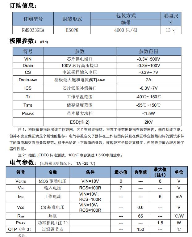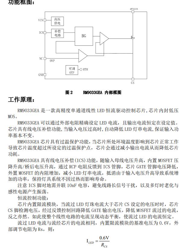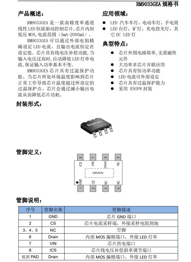 RM9033GEA 是一款高精度單通道 線性 LED 恒流驅(qū)動(dòng)控制芯片,芯片內(nèi)封 低壓 MOS,電流范圍(5mA-2000mA)。 RM9033GEA 可以通過(guò)外部電阻精 確設(shè)定 LED 電流,且輸出電流恒定在 設(shè)定值。芯片具有線電壓補(bǔ)償功能,當(dāng) 輸入電壓過(guò)高時(shí),自動(dòng)降低 LED 燈串電 流,保證輸入功率基本不變。 RM9033GEA 芯片具有過(guò)溫保護(hù)功 能,當(dāng)芯片所處環(huán)境溫度影響到芯片 正常工作導(dǎo)致芯片溫度超過(guò)所設(shè)定的 過(guò)溫保護(hù)點(diǎn),芯片會(huì)通過(guò)減小輸出電 流從而降低芯片功耗。